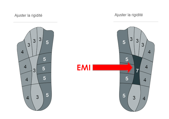 Lors de la cinétique de la semelle, un appui plus important se fait alors sous le pied à l’endroit précis. Cela apporte le même bénéfice qu’un élément postural mais sans avoir l’effet indésirable de relief. L’EMI est posé au milieu de la semelle, réglé à 7.